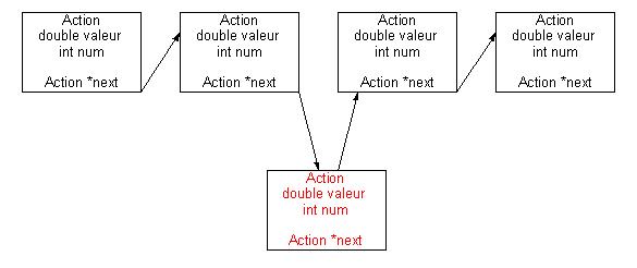 Par exemple, sur l'exemple, on enregistre une liste chainée d'objet de type Action. Chaque Action est définie par des champs propres et en plus par un pointeur sur Action qui référence l'objet suivant de la liste. L'ensemble de la liste est conservé par un pointeur Action * sur le premier élémnet de la liste. Il est ensuite possible de parcourir la liste en passant d'élément en élément. Pour modifier la liste et ajouter une Action a après une Action a2 qui pointe sur une Action a3, on fait pointer a2 sur a et on fait pointer a sur a3.