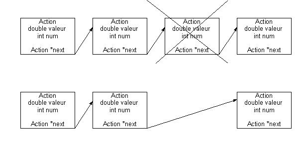 Pour supprimer un élement Action a2 de la liste, en supposant qu'il est compris entre un élément a1 et un élément a3 : on supprime a2 et on fait pointer a1 sur a3.